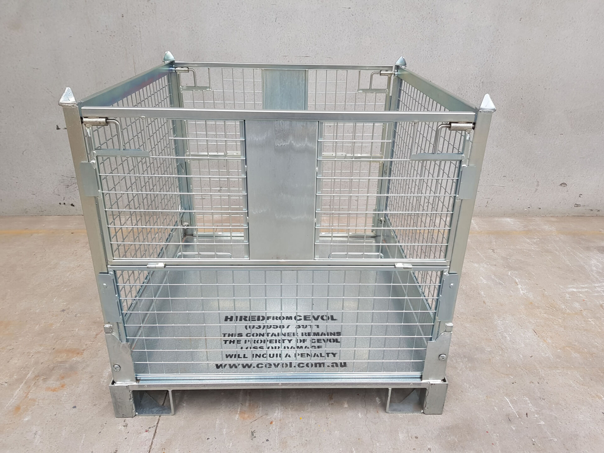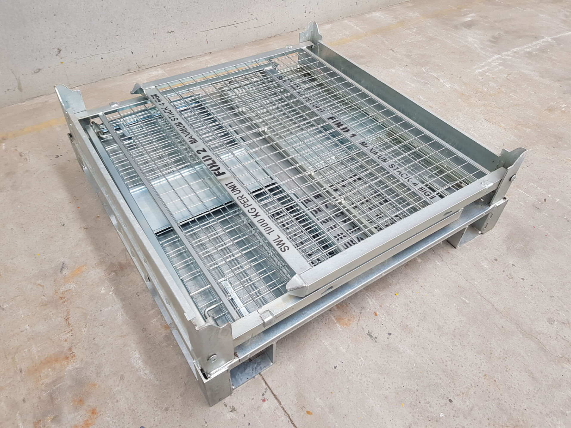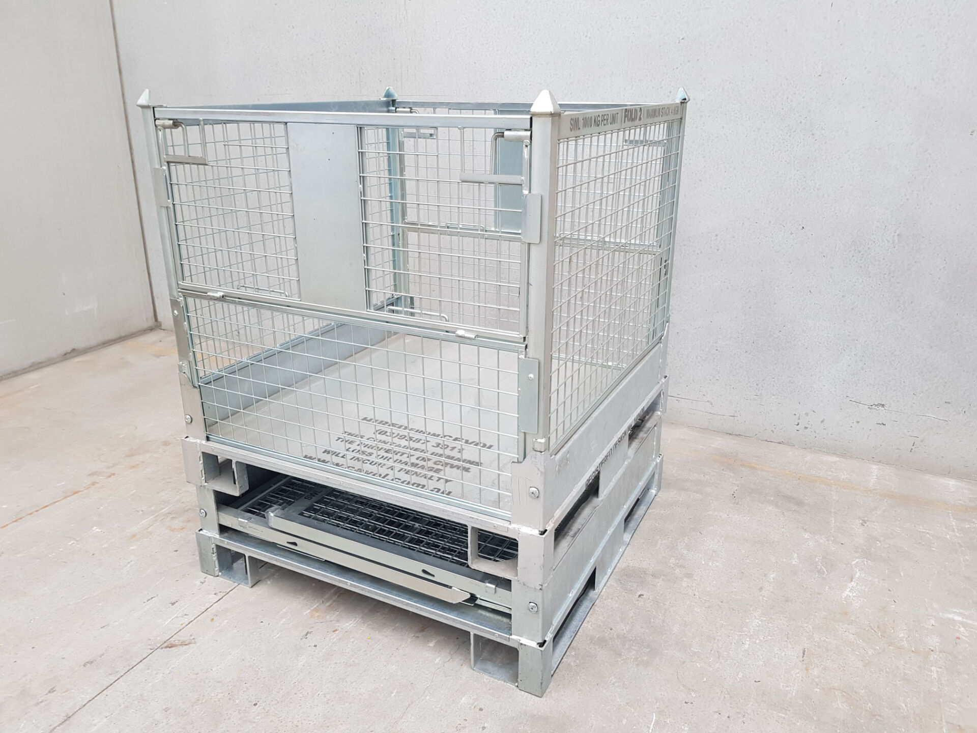Galvanised base zinc plated gates & sides sound deadening material on base. No pinch points on gate latches barcoding standard. Nests in standard racking gates half drop & remove fully - walk in access ends. Tensioned to stop them falling parts easily replaced & interchangable positive stacking method "Australia Post Approved"