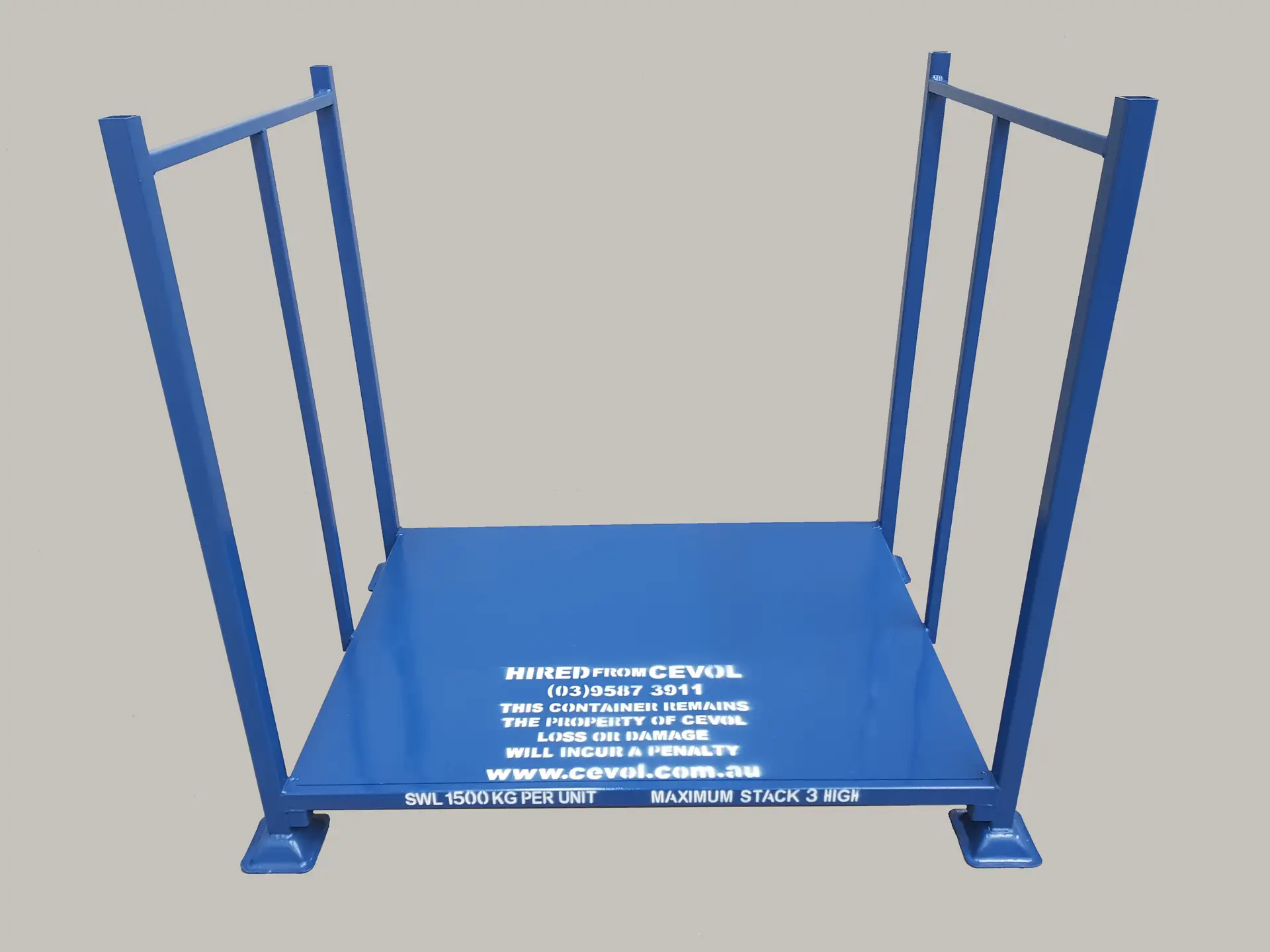 Each stillage hired out by Cevol Industries is in a safe usable condition, stenciled with the maximum capacity and stacking height.
